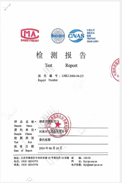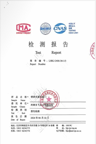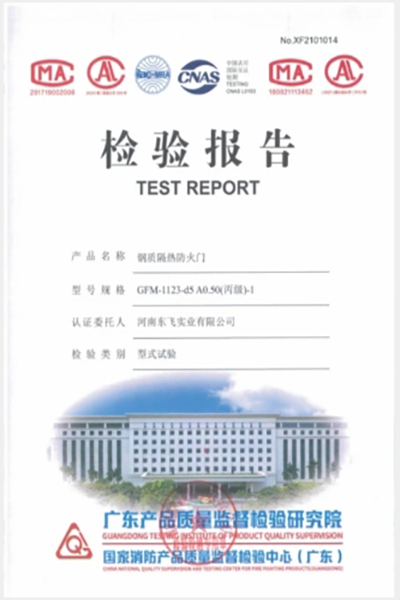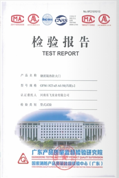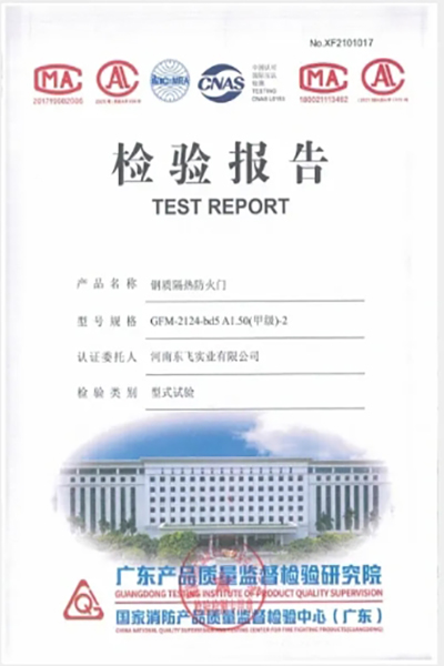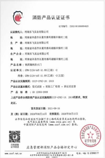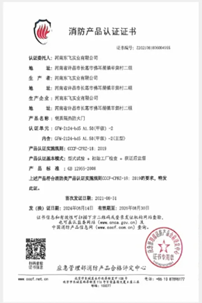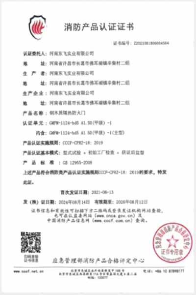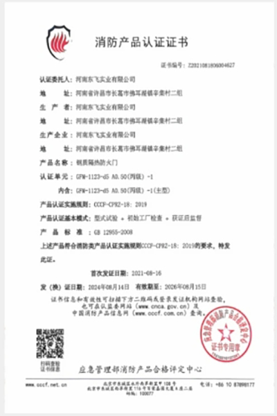 鋼質隔熱防火門分為甲、乙、丙級,均嚴格按照 GB12955-2008《防火門》研制而成?!皣夜潭缁鹣到y和耐火構件質量監督檢驗中心”檢驗合格,并取得應急管理部消防產品合格評定中心發放的“中國國家強制性產品認證證書”。